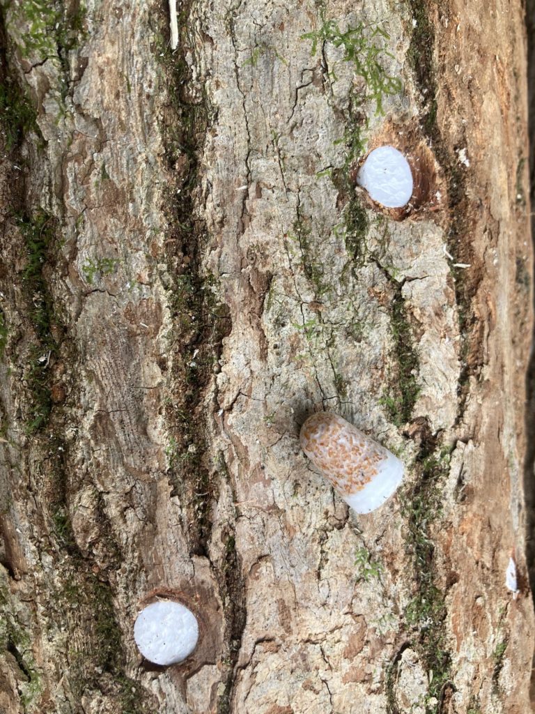 椎茸の種コマを打ち込んで、椎茸栽培の準備をしています。