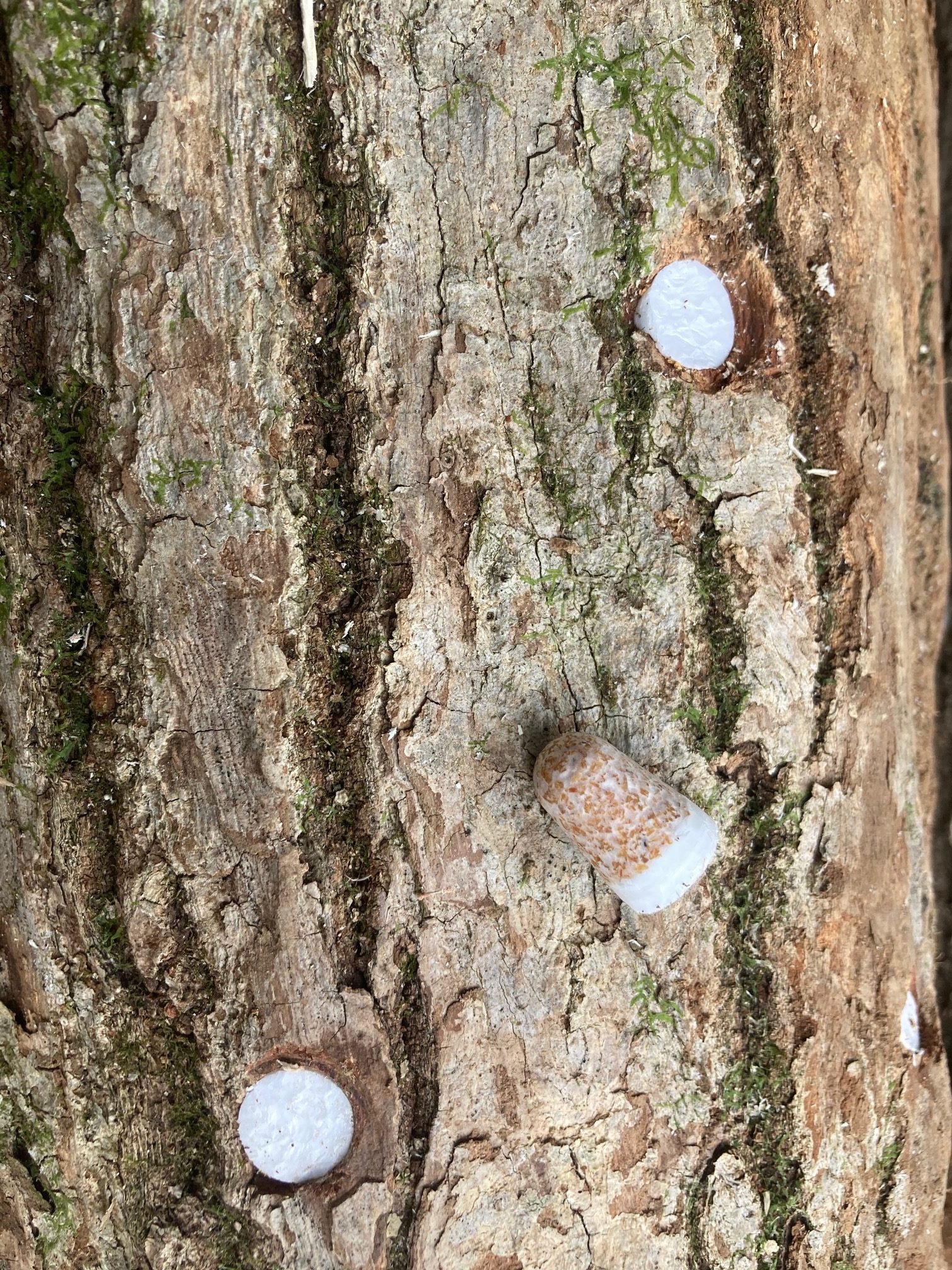 1つずつ原木に穴を開けて、椎茸の種菌を入れていきます。
